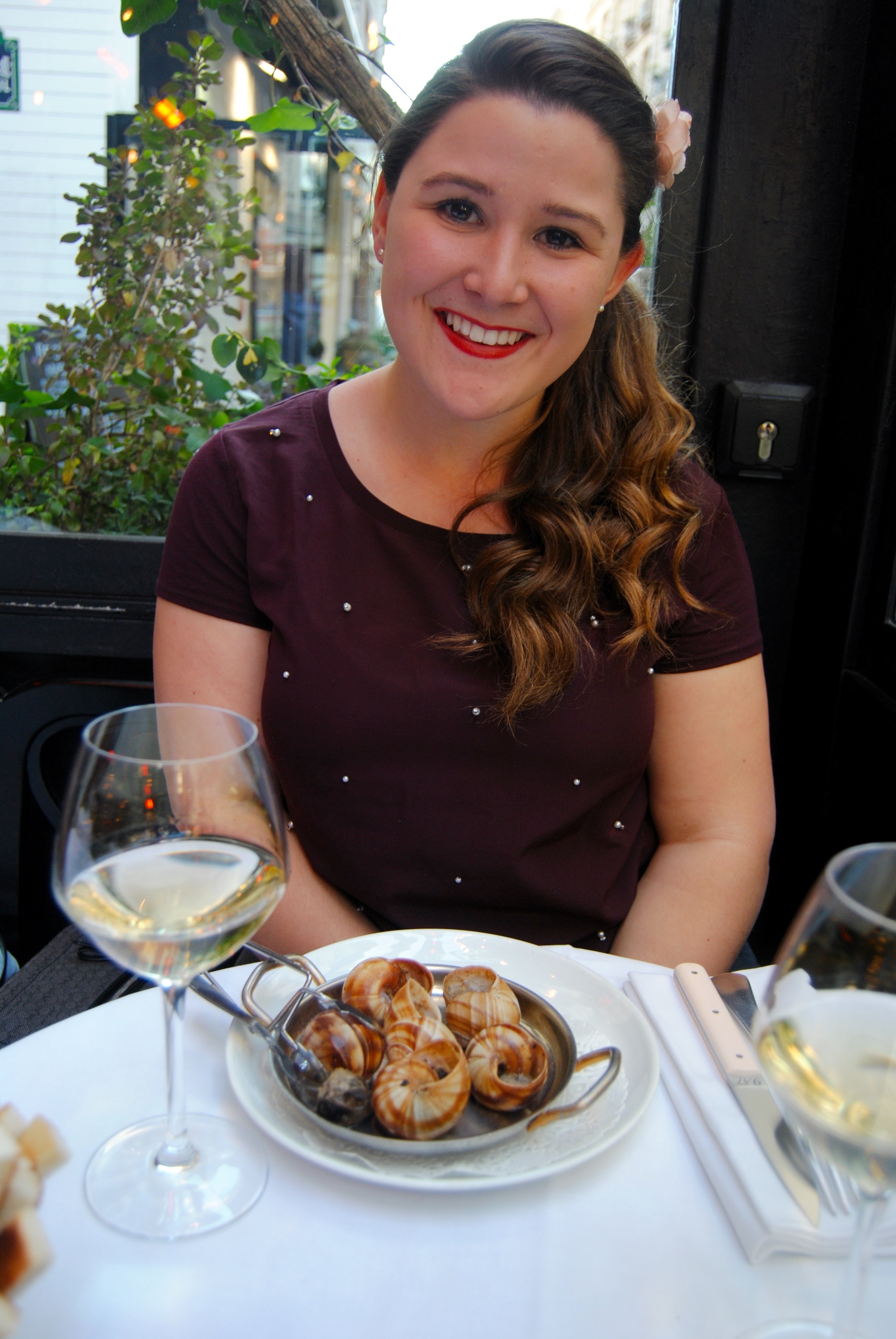 We spent a solid hour, probably more, by the Eiffel Tower, but it’s only so long that you can look at a building and take pictures of it, no matter how pretty it is. We grabbed a baguette before quickly dropping our stuff at the hostel and heading back out for dinner. When we left for Paris, Mel and I both promised we would try escargot. We wanted to make sure that we had it from a restaurant that had good reviews, so we asked our hostel what they recommended. The restaurant was called L’Escargot Montorgueil, and when we arrived it looked like we would have a very wonderful, and classy evening. The restaurant had a golden snail atop the sign and little plants positioned along the windowsills.
