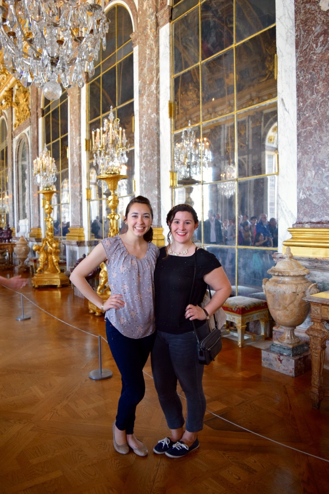 The next morning, Mel, Jess, and I left around 9 AM to head to Versailles. The Chateau and past home of Louis XIV, and many succeeding French kings, is located in the town of Versailles, which is a little over an hour outside of the city. Luckily, the Paris metro is a God send and extremely easy to figure out. We double checked the trains we had to take at the hostel before hopping on the metro. An overall peaceful ride, we watched the sites of city and rural France roll by out the windows. When we arrived, we followed the mass of people who we hoped were all going to the same place we were — they were. Once again, we assumed we would have to trudge through hoards of people and wait in an endless line before we could enter the palace. Once again, we were wrong. Our visas allowed us to enter the palace for free, and once we had our document checked, we entered right away. The tour came with a free audio guide, which not only makes me feel like a huge tourist, but a real life adult, ew.
